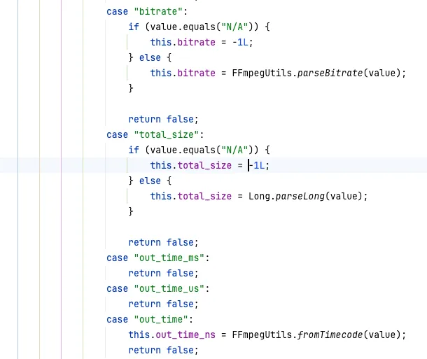 여기에서 진행상황 중에 out_time 이라는 키가 포함되어 있는데, 왜인지 모르겠지만 그 값이 out_time=N/A로 들어온다. 여기서 문제가 발생하는데 bitrate나 total_size는 값이 N/A인 경우, -1L을 저장하게 되어 있는데 out_time은 그런게 없이 냅다 Exception을 반환해버린다. 그렇기 때문에 Exception in thread "TcpProgressParser(tcp://127.0.0.1:60771)" java.lang.IllegalArgumentException: invalid time 'N/A' 라는 예외가 발생해버린 것이다.