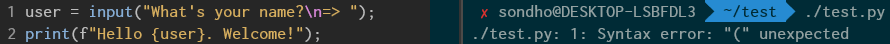 # test.py user = input("What's your name?\n=> "); print(f"Hello {user}. Welcome!"); ## # 실행 결과 # $ python test.py # ./test.py: 1: Syntax error: "(" unexpected ## -