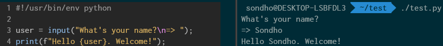 # test.py #!/usr/bin/env python user = input("What's your name?\n=> "); print(f"Hello {user}. Welcome!"); ## # 실행 결과 # $ chmod +x test.py # $ ./test.py # What's your name? # => Sondho # Hello Sondho, Welcome! ##